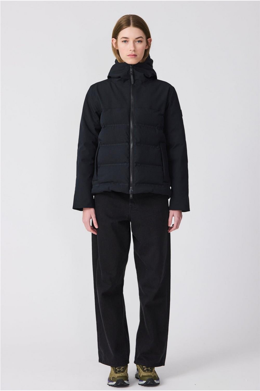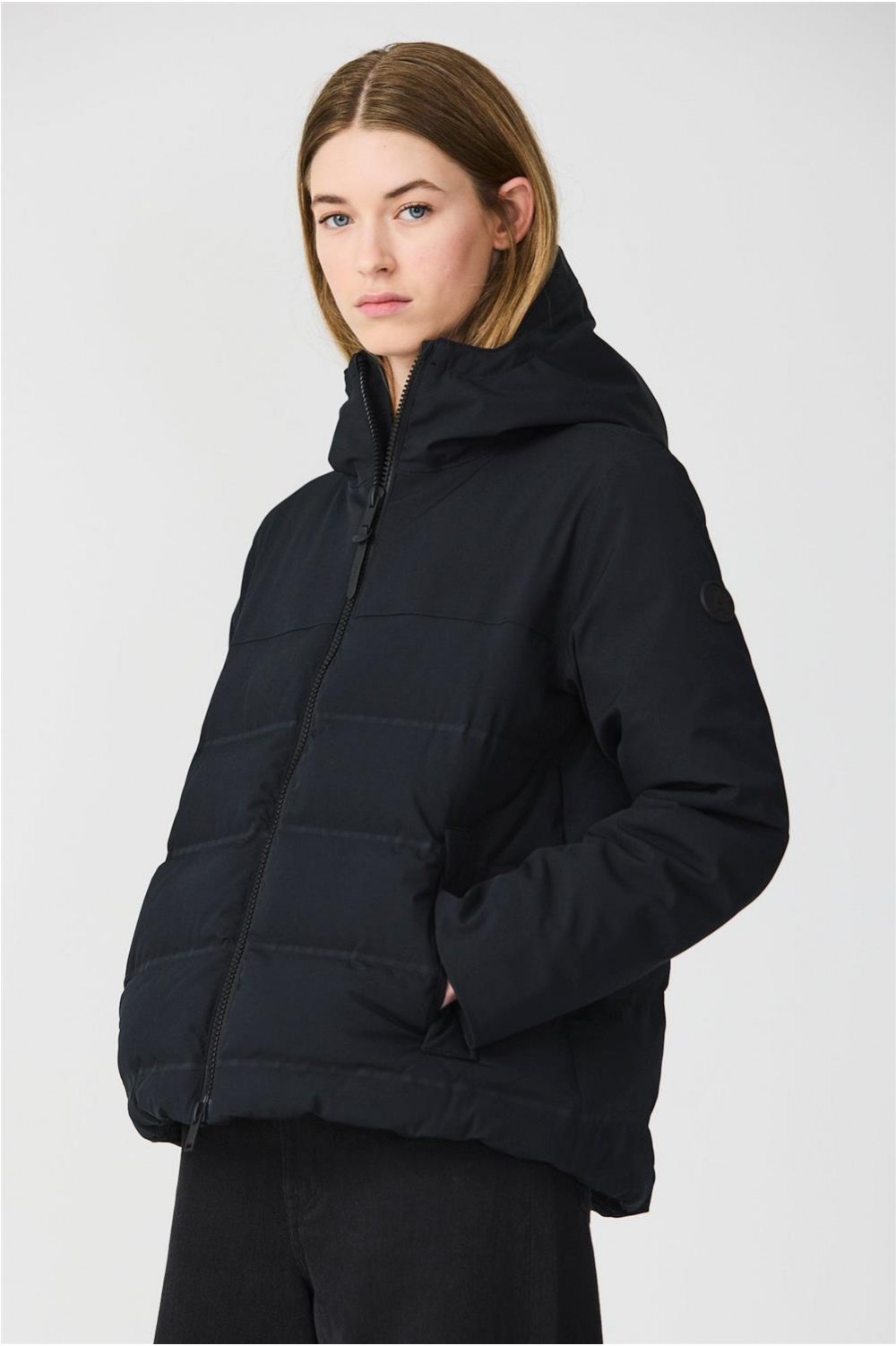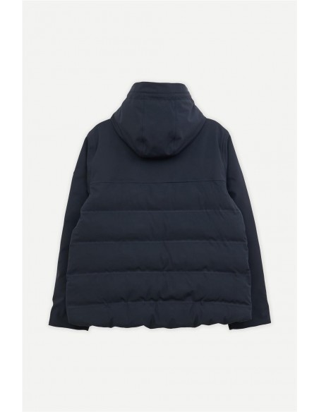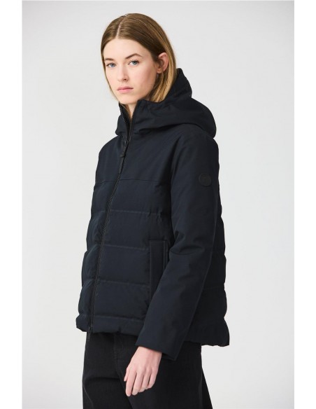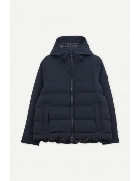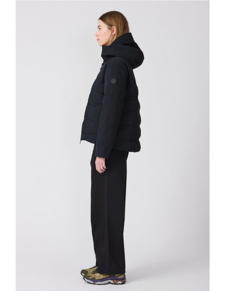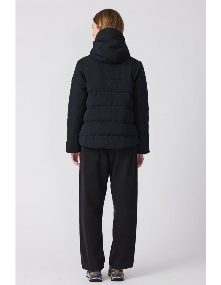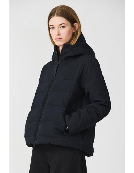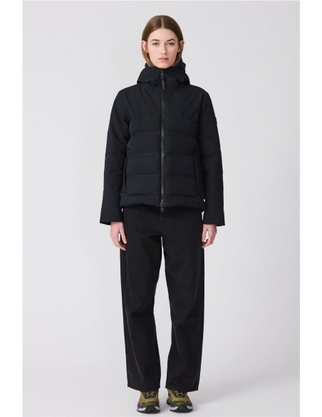 Plumífero Tanta en tejido Softshell impermeable y acolchado con aislamiento ligero, transpirable, sin plumas y corte evasé. Sus costuras completamente selladas garantizan una protección total contra el agua, mientras que las mangas, capucha y los paneles superiores delanteros y traseros en tejido liso aportan un elegante contraste. El diseño se remata con una cremallera frontal impermeable de doble cursor y detalles en tonos a juego para un acabado pulido y moderno.