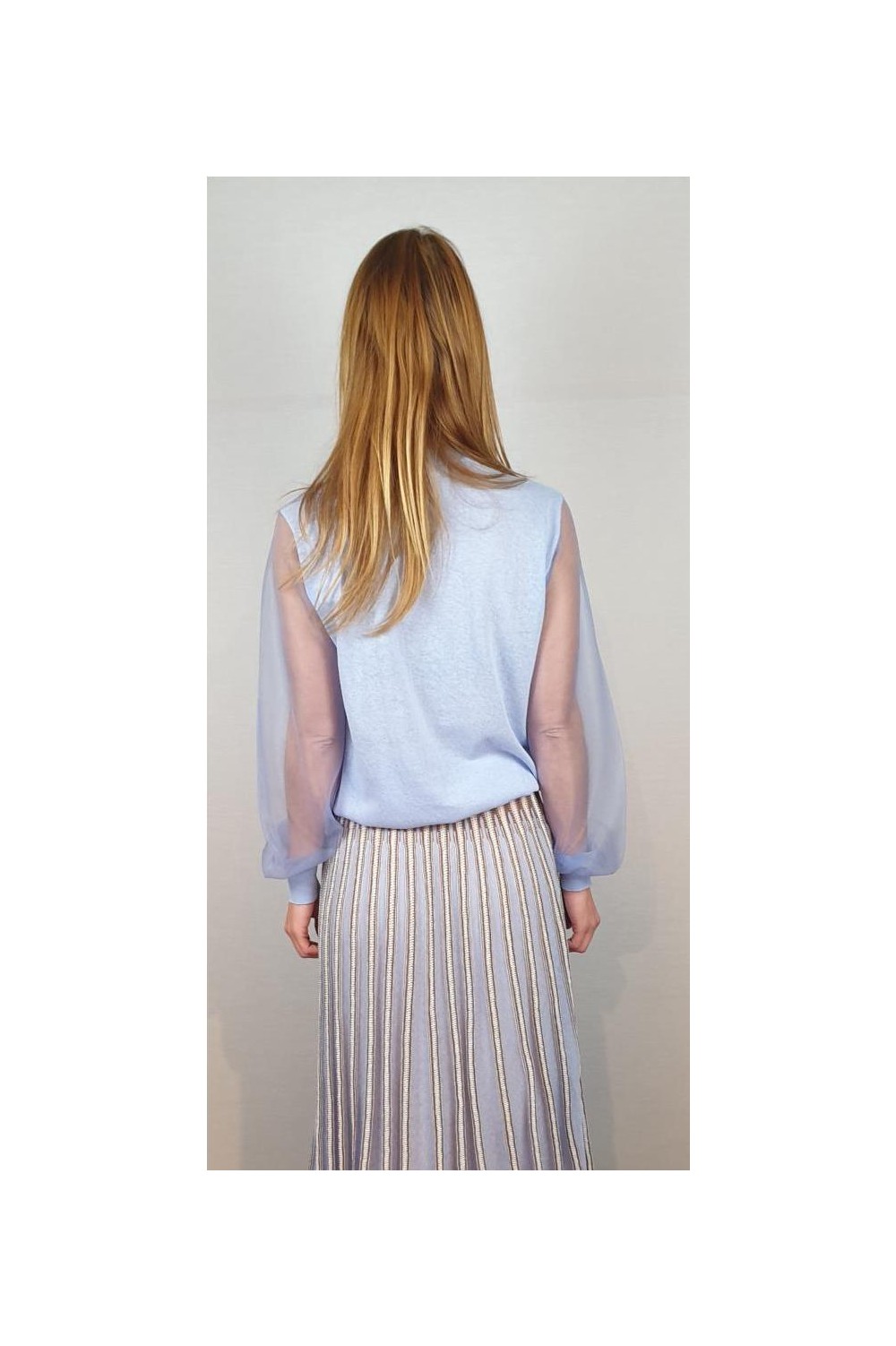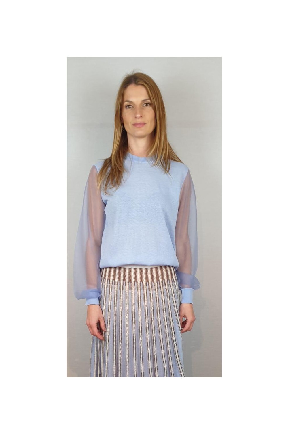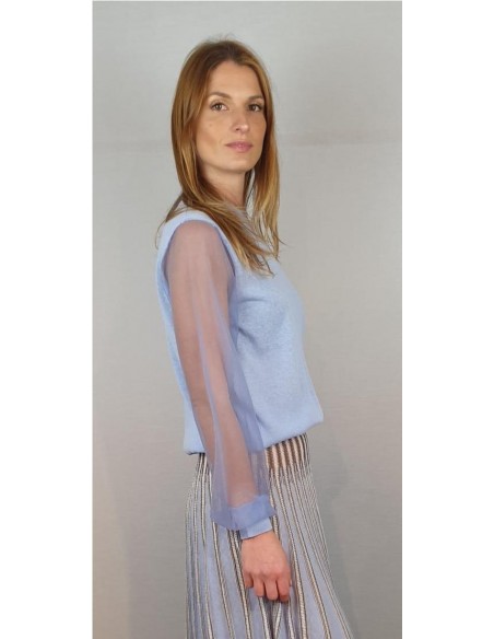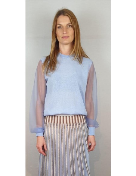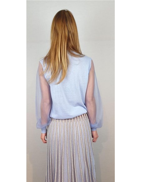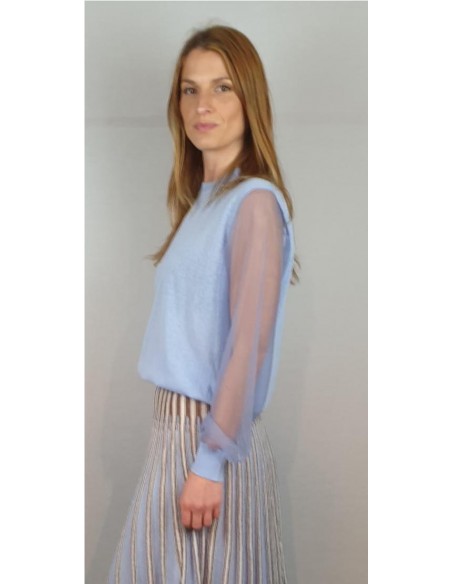 Jersey reducido con escote redondo y mangas transparentes tejidas con monofilamento de punto. Composición: 46% Algodón - 23% Nylon - 20% Lino - 7% Elastano - 4% Poliéster