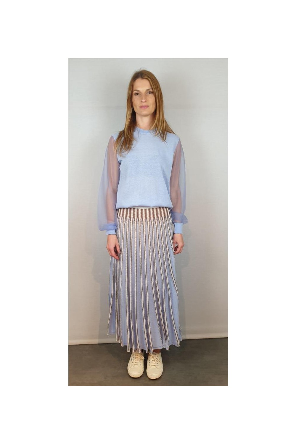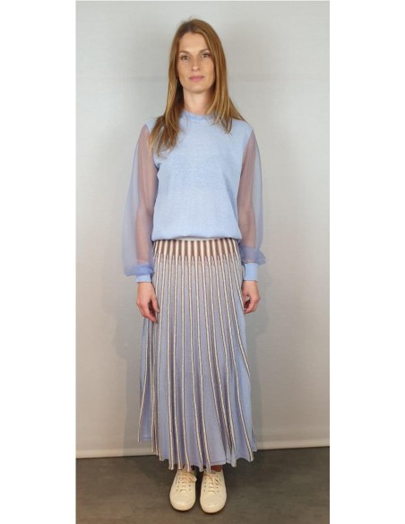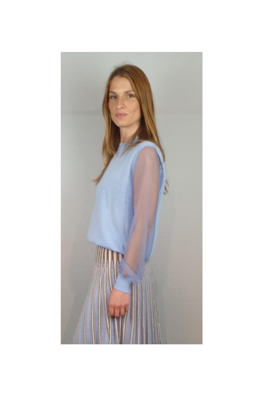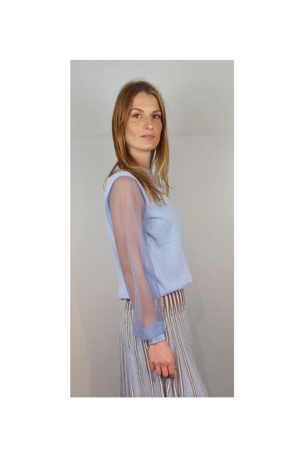 Jersey reducido con escote redondo y mangas transparentes tejidas con monofilamento de punto. Composición: 46% Algodón - 23% Nylon - 20% Lino - 7% Elastano - 4% Poliéster