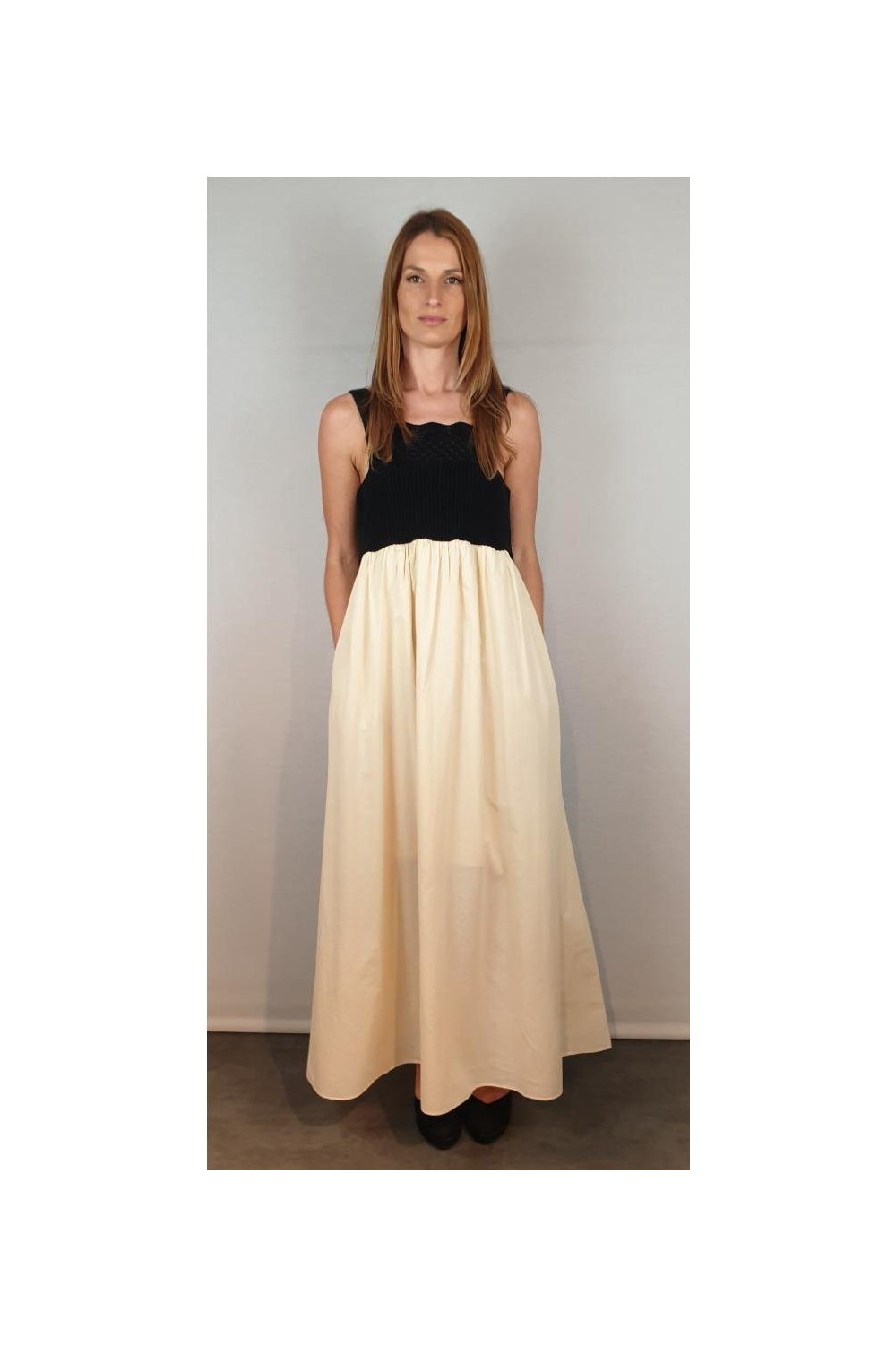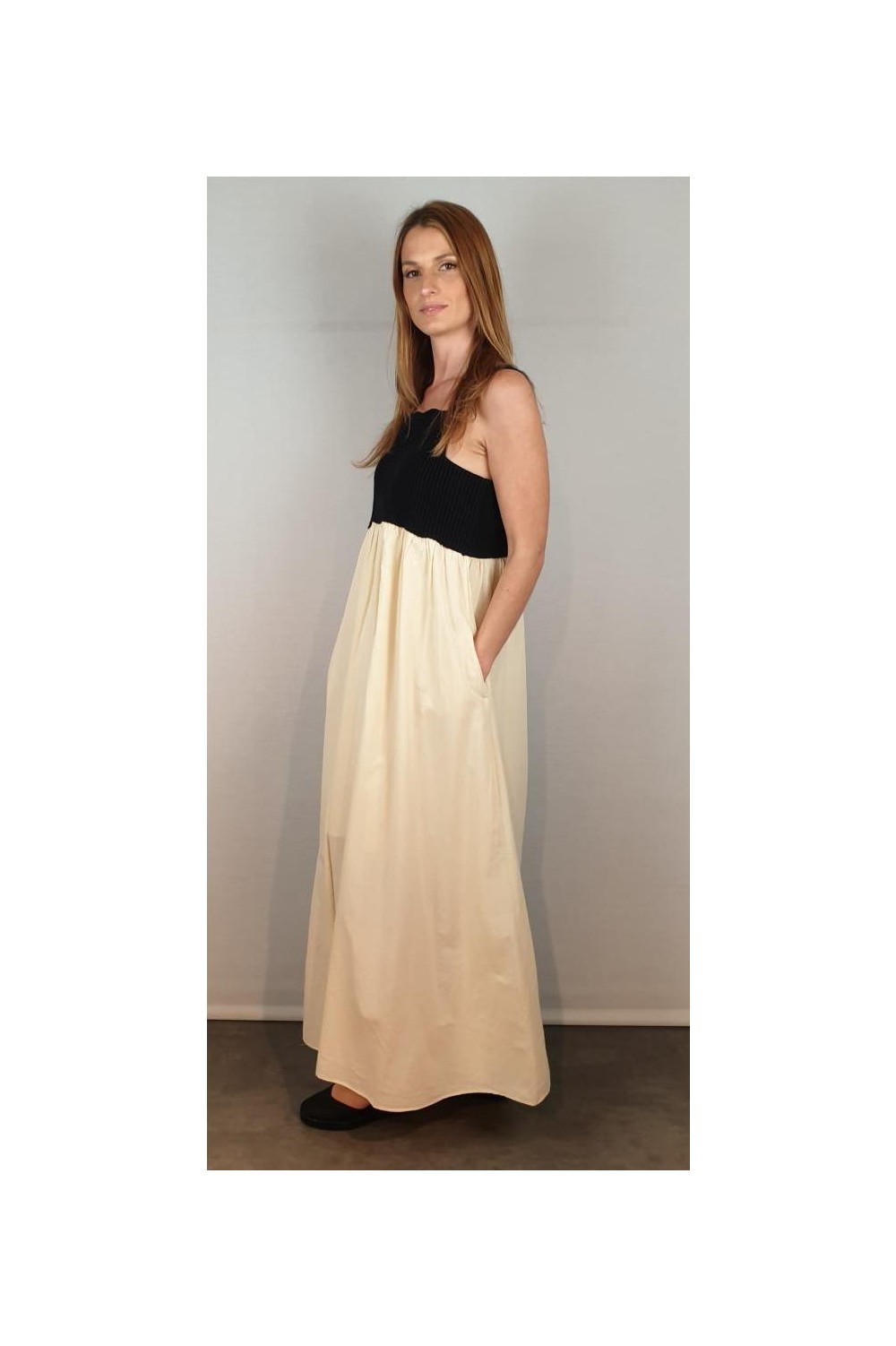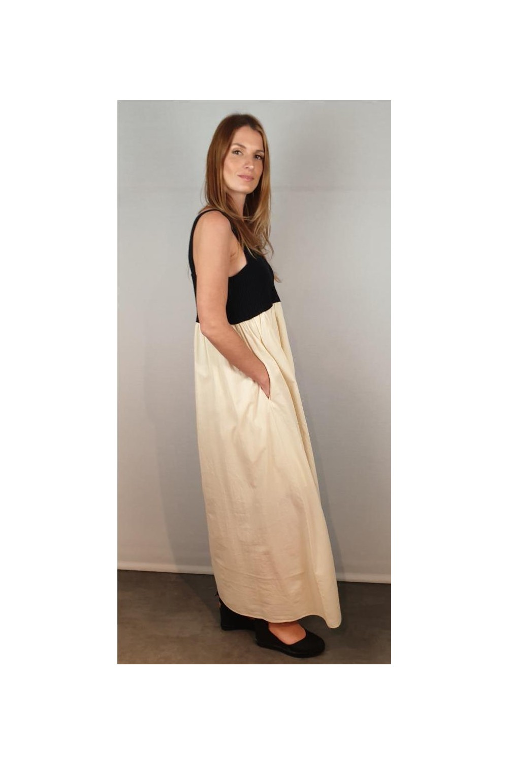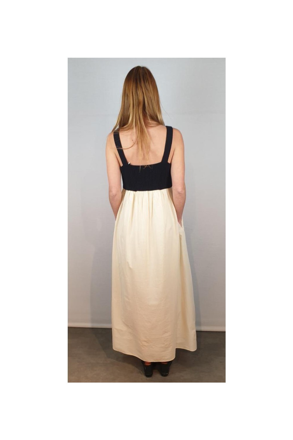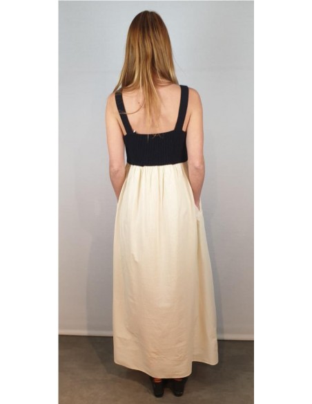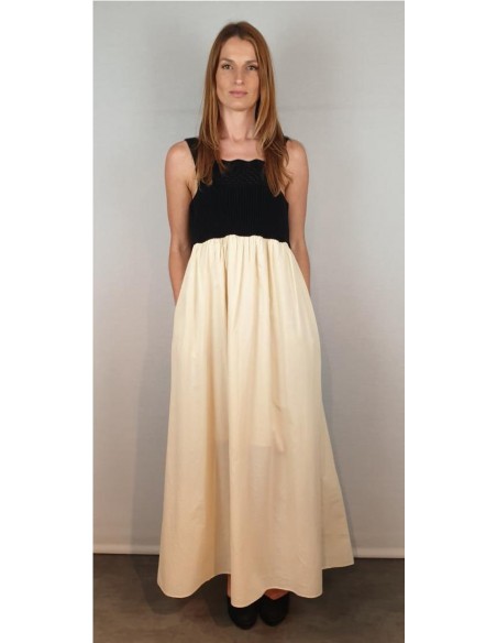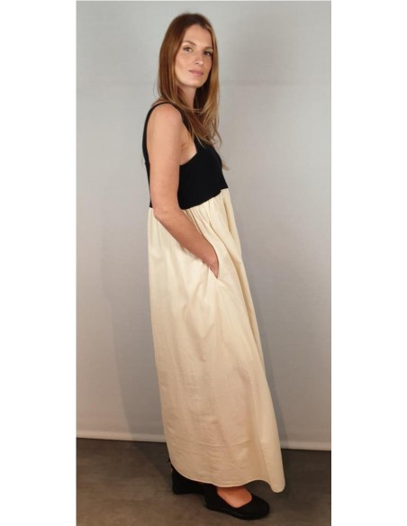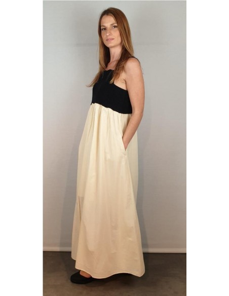 Vestido de tirantes con corte bajo el pecho. La parte del cuerpo es de punto en color negro y la falda de algodón voile en color crudo con forro del mismo tejido. Composición: Punto: 100% Algodón / Tejido: 100% Algodón